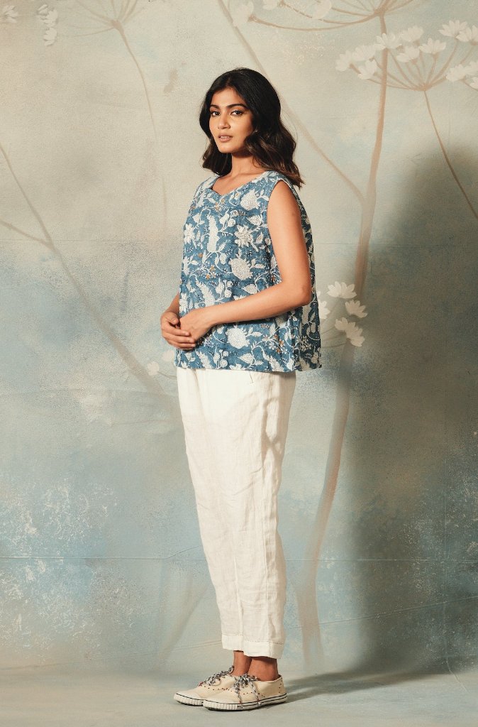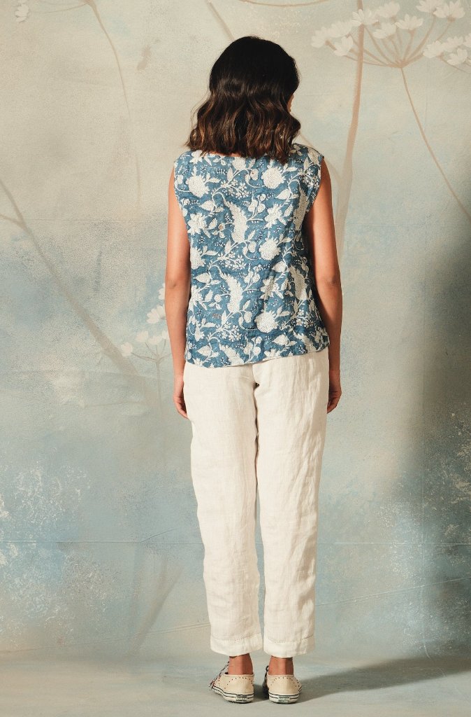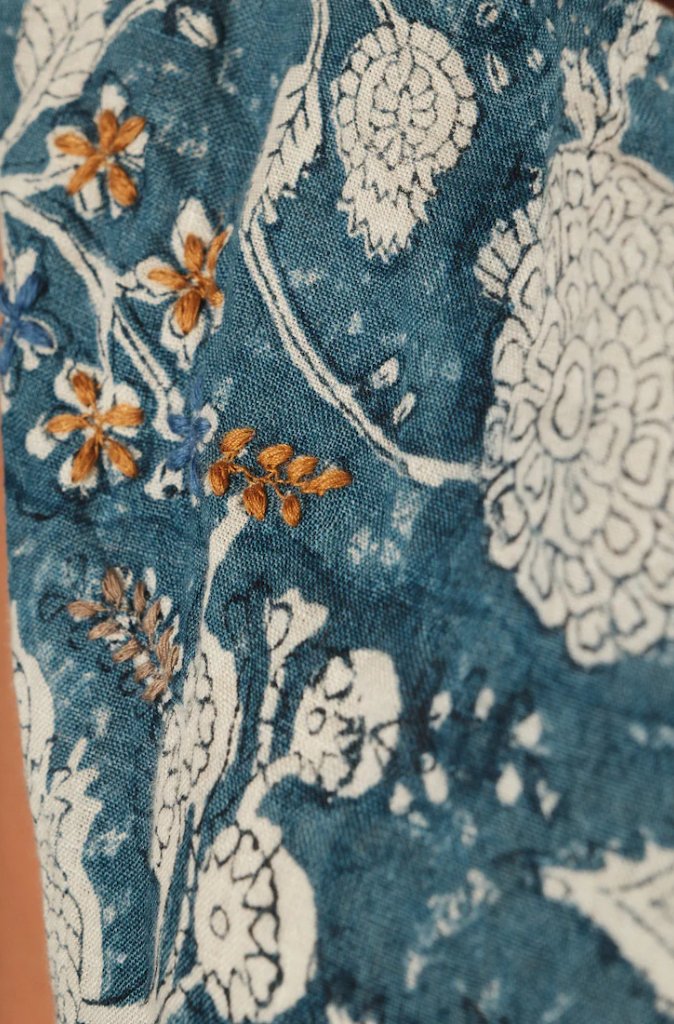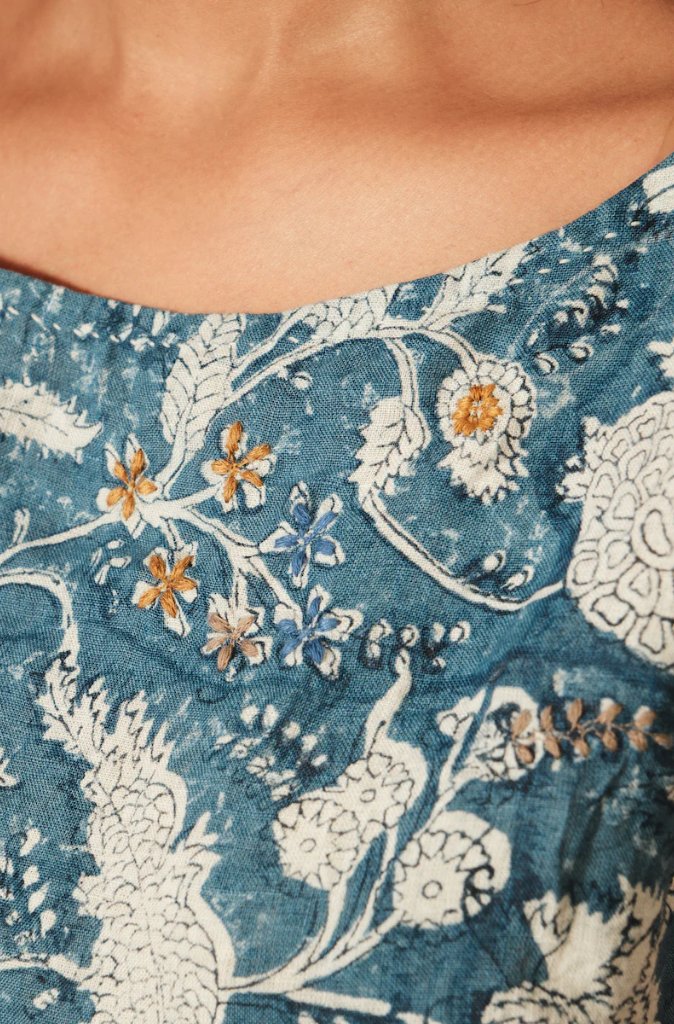 Made from a soft linen with a gorgeous indigo blockprint, the Aishani is a simple but beautiful boxy shaped top that is a staple piece from Dve. Handstitching in ochre and cobalt over some flowers gives each top a unique and individual craftsmanship appeal