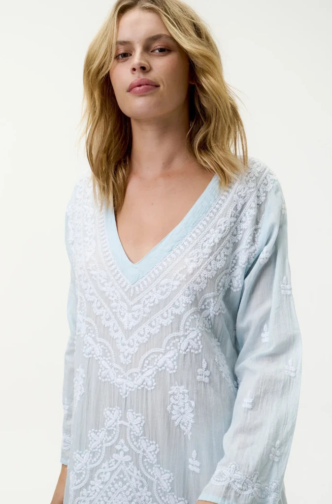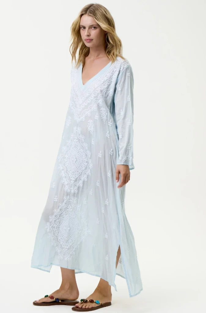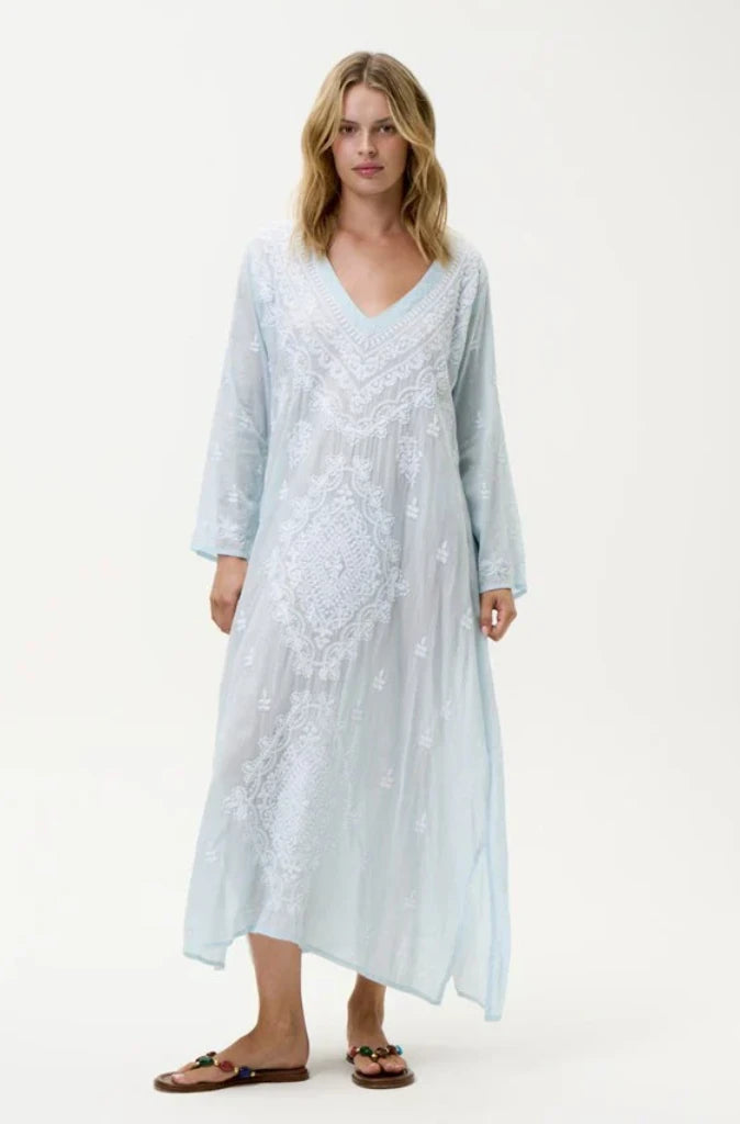 Longtime fans of One Season will recognise the Goa design as a mainstay of One Season's collections. The Goa dress has a hand embroidered look and is a OneSeason must-have for the beach. This contemporary take on the classic kaftan features a deep V-neckline and side splits for long walks or lounging.