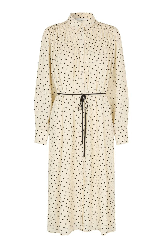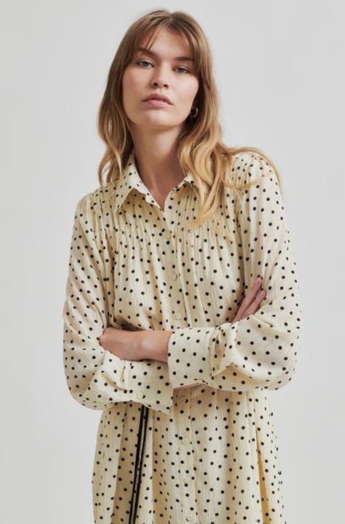 Second Female polka dot dress. The dress is made in lightweight recycled polyester with slightly crinkled texture and all-over polka dot pattern. Featuring a regular collar and button-through fastening with covered buttons. Tie belt at waist. Smocked details at shoulders and chest. Long sleeves with buttoned cuffs. Lined body with unlined sleeves.