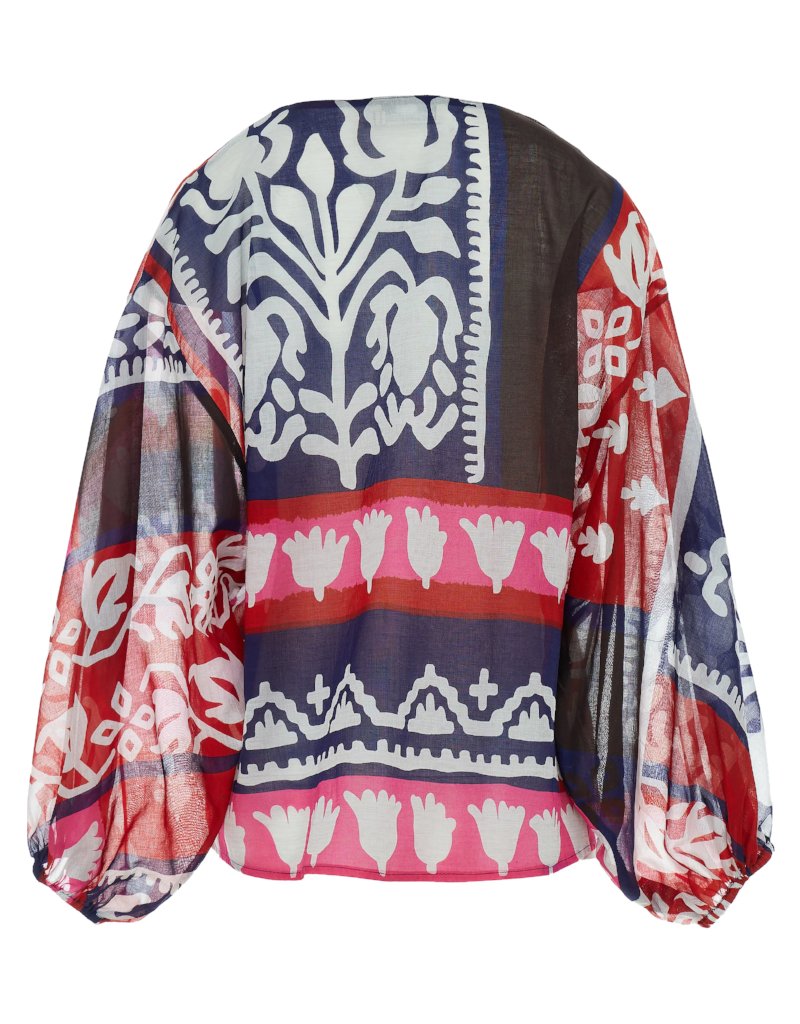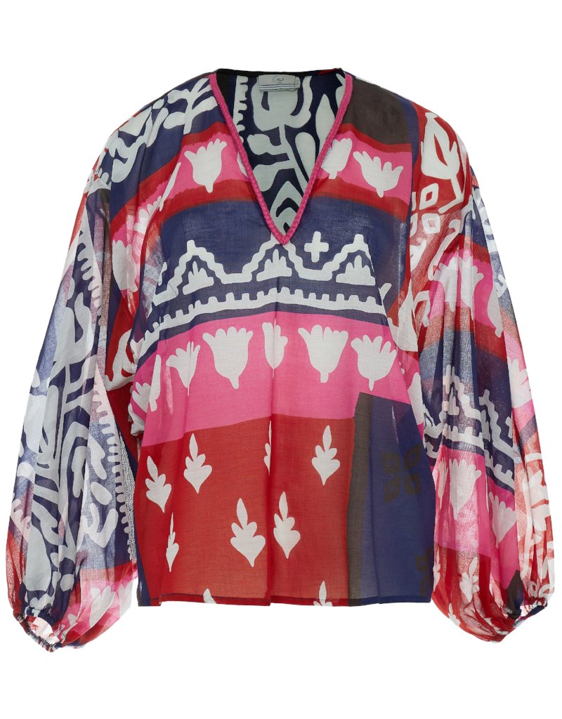 The perfect summer blouse, the dramatic Radiant from Devotion Twins combines the softness of cotton voile with the brand's signature boho luxe aesthetic. With its 'V' neck trimmed in hot pink plaited braid and full sleeves this is a cool, floaty top to wear with jeans , shorts or cool white pants.