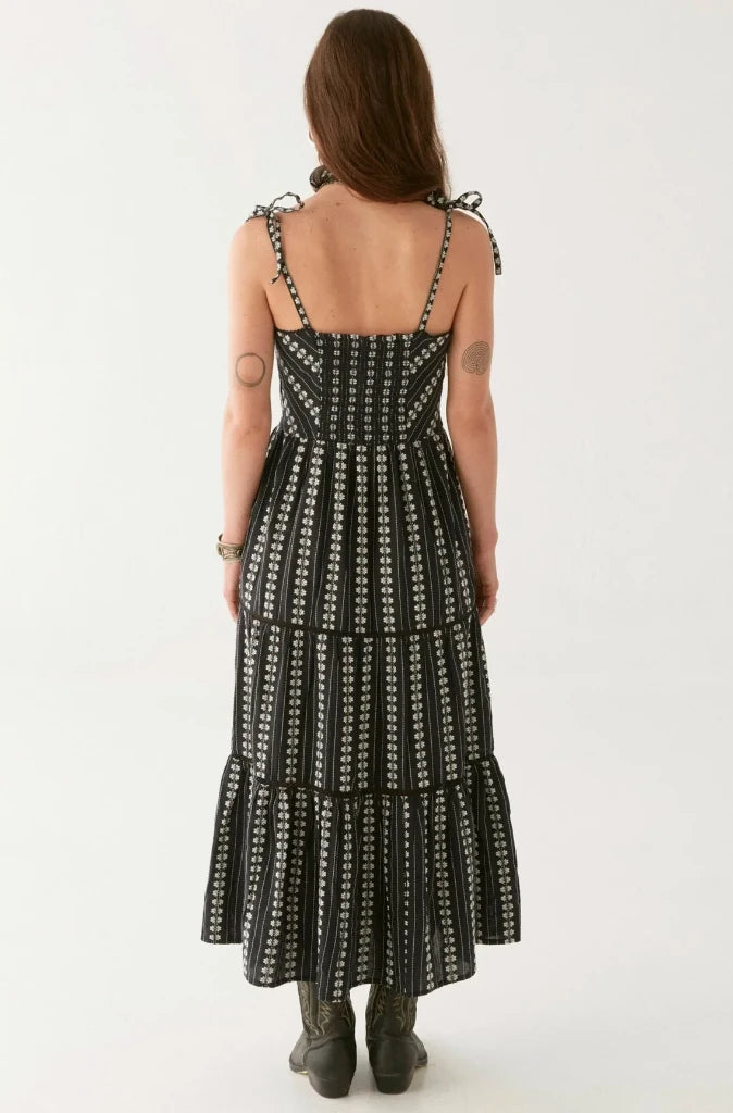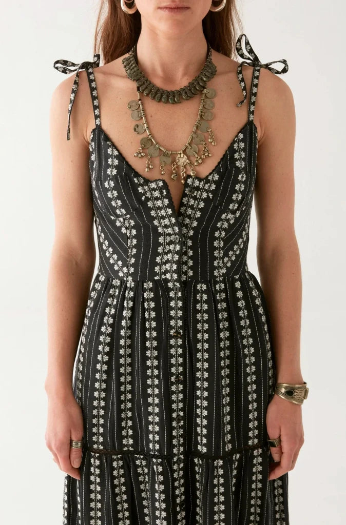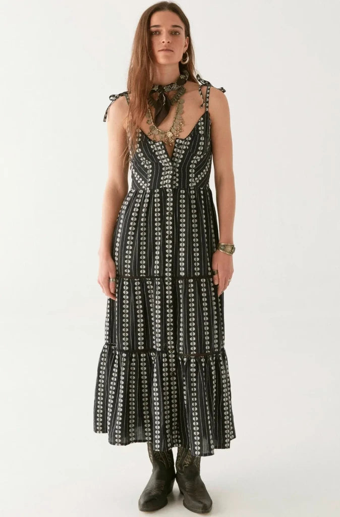 Meet the Maison Hotel Venus Dress, an effortless blend of romance and bohemian ease. Crafted from soft, breathable cotton, it feels weightless while making a striking impression. The deep black base highlights delicate ivory embroidery, stitched in vertical lines that naturally elongate the silhouette.