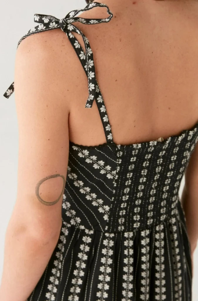 A smocked bodice creates a flattering, comfortable fit, while the tiered skirt adds soft movement. Adjustable tie straps finish the look with a touch of relaxed charm.
