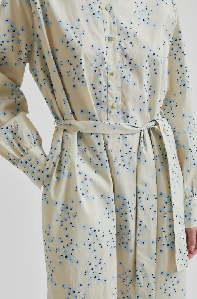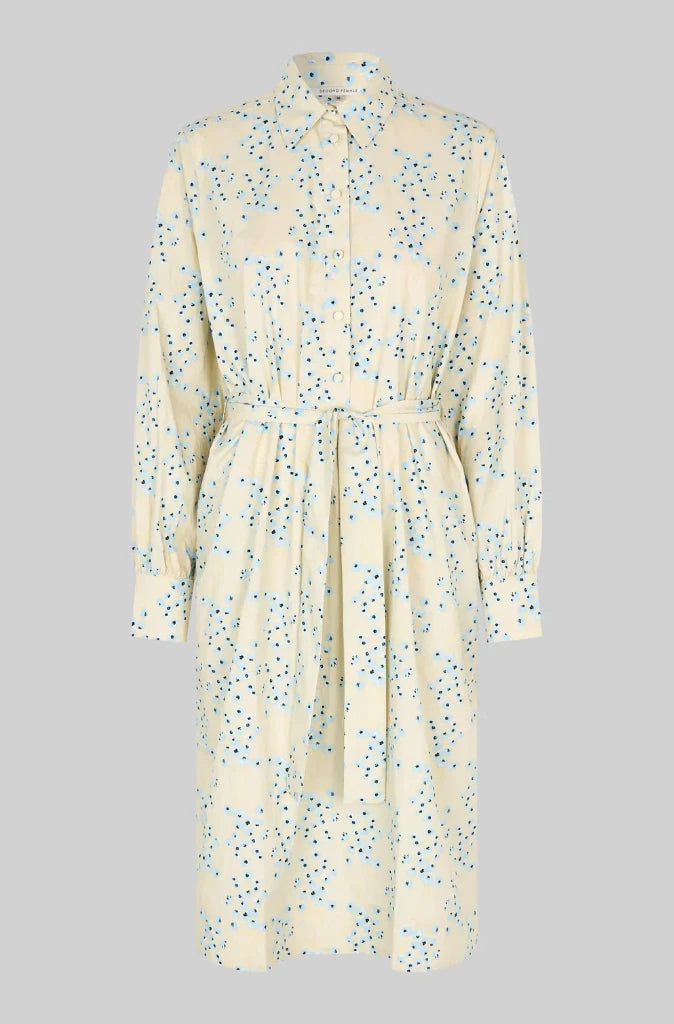 Second Female floral-print shirt dress. The shirt-dress is made in light and smooth organic cotton with an all-over floral pattern. Featuring a regular collar and half placket with covered button fastening. Detachable fabric belt at waist. Long sleeves with buttoned cuffs. Two in-seam side pockets. Slits at sides. Loose, straight fit that can be brought in with the belt.