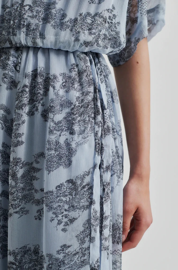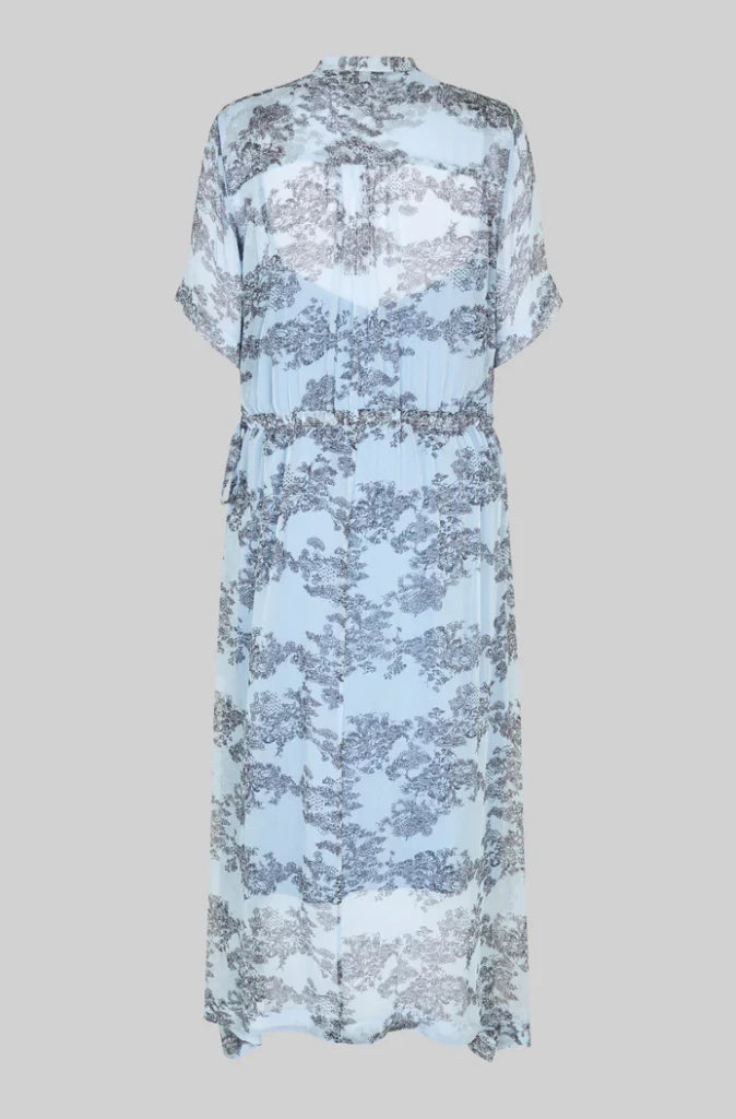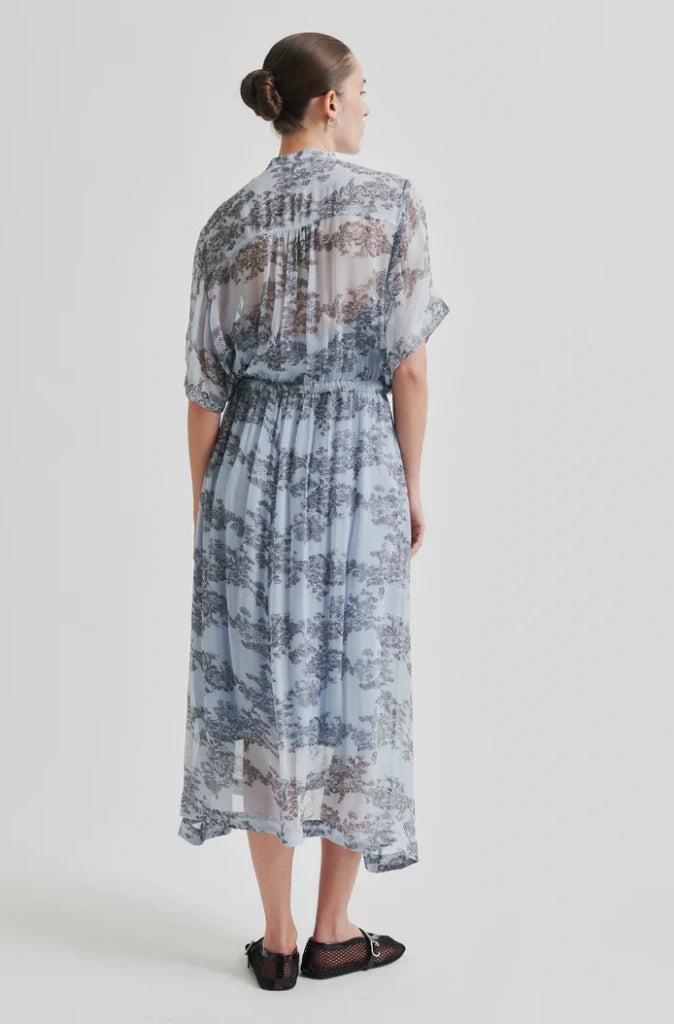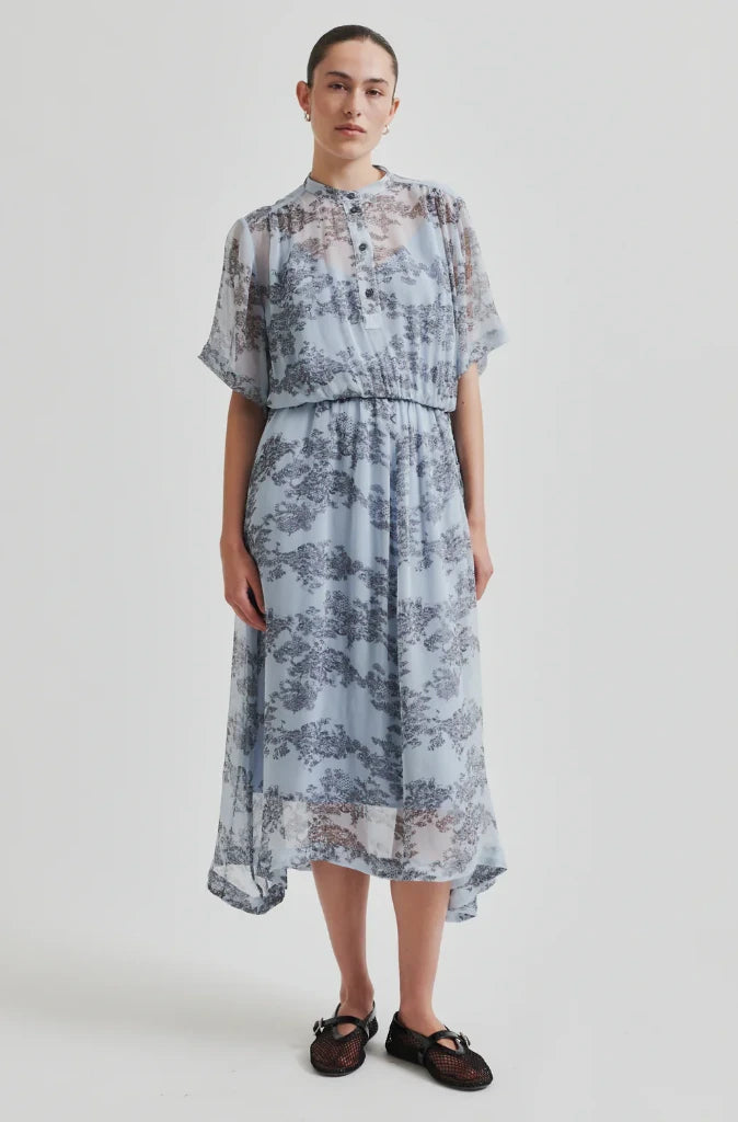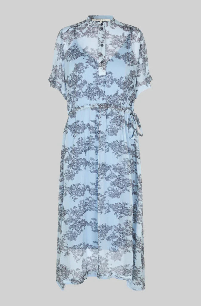 Second Female short-sleeved dress. The dress is made in light, semi-sheer viscose with all-over pattern. Detachable and adjustable underslip. Featuring a half placket with button fastening and drawstring with ties at both sides of the waist. Loose fit that can be pulled in with the ties for a more defined silhouette.