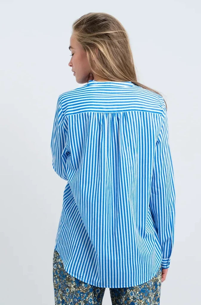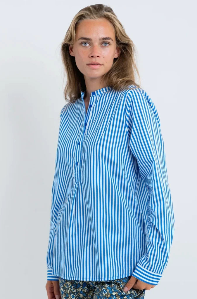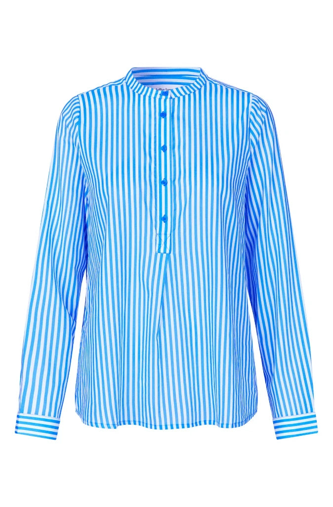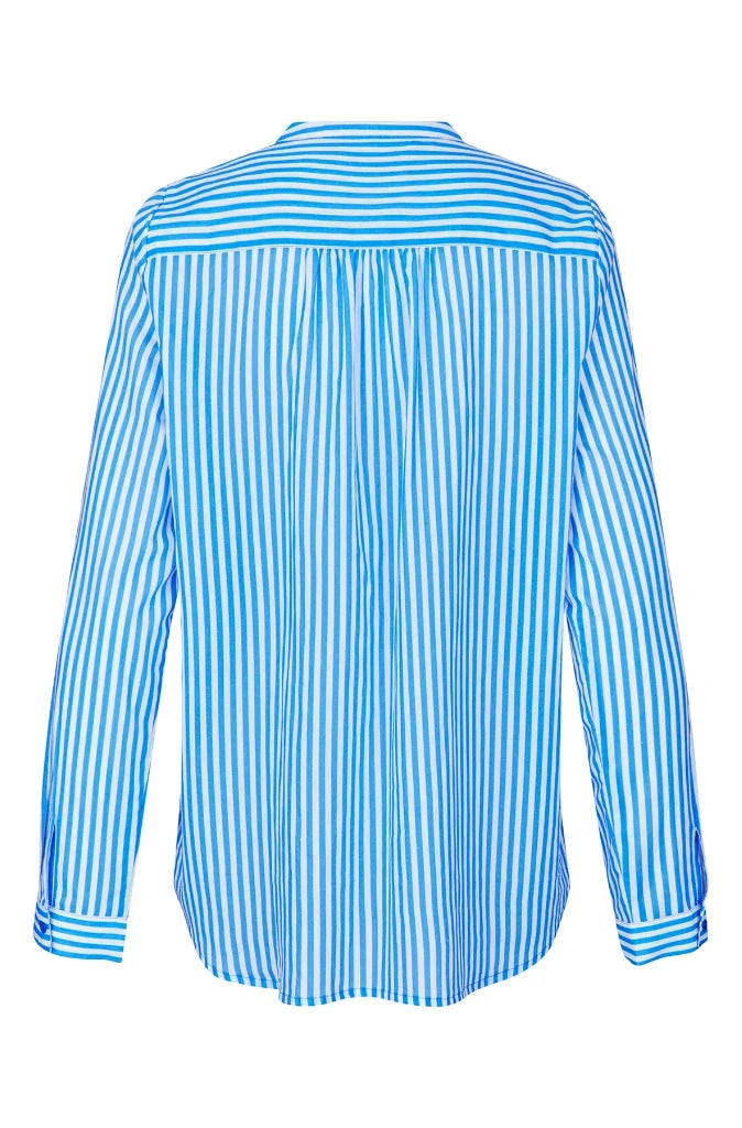 Cut in super soft cotton, the LuxLL shirt has a vibrant blue and white stripe. It features a relaxed fit with a fitted back yolk then gathering off the yoke. It has a round collar and 4 button closure to the chest and long sleeves with classic buttoned cuffs