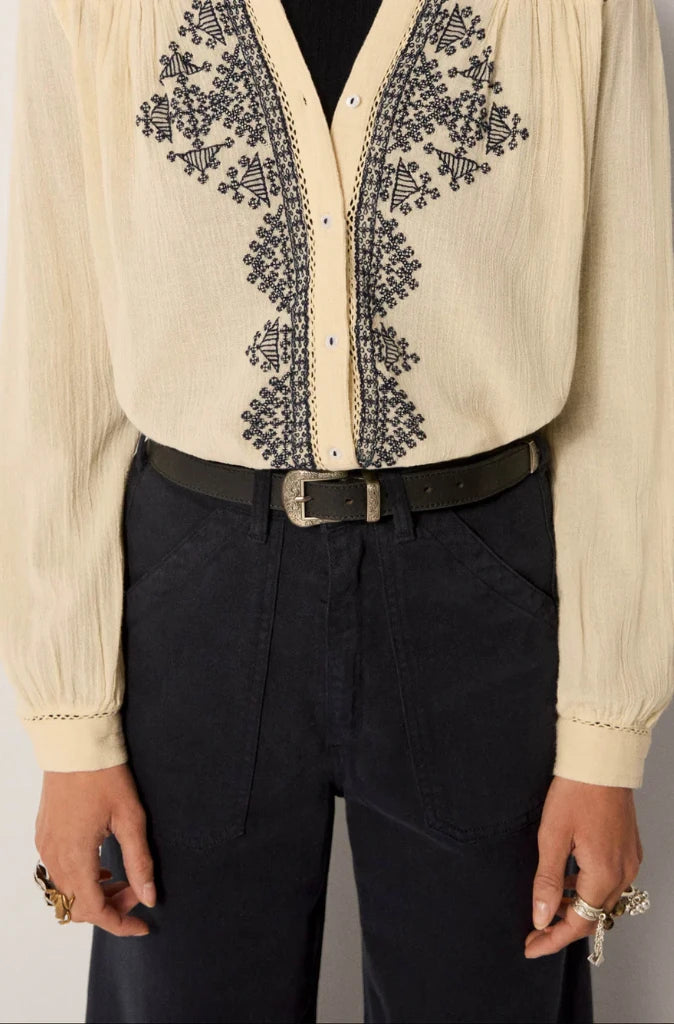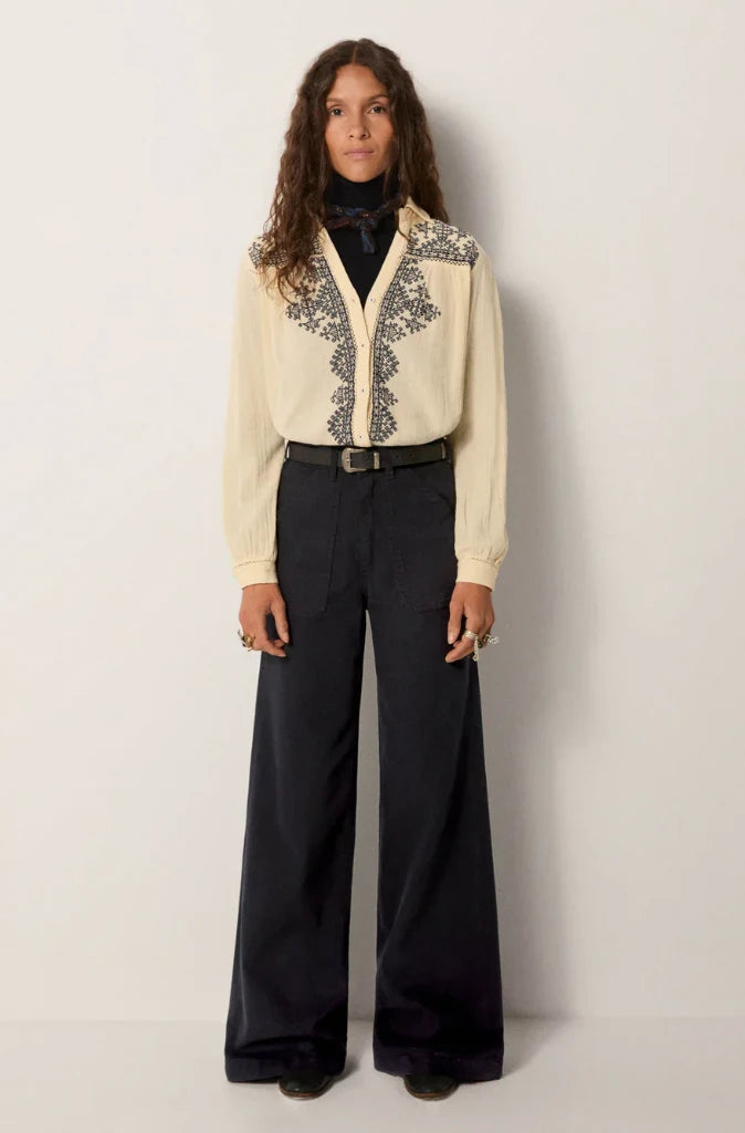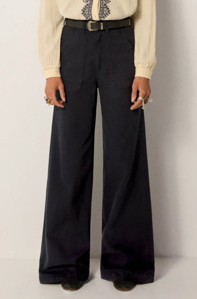Designed with a wide-leg silhouette, it features two front and two back patch pockets, combining practicality with relaxed structure. Subtle tailoring elongates the leg while keeping the look effortless and easy to wear.