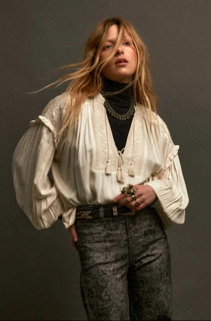 Tonal detailed embroidery across the front bib and shoulders introduces an artisanal element, enhancing the blouse with delicate texture and understated character.
