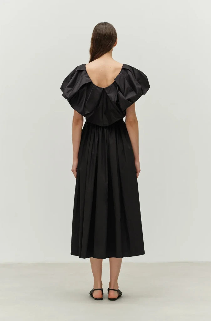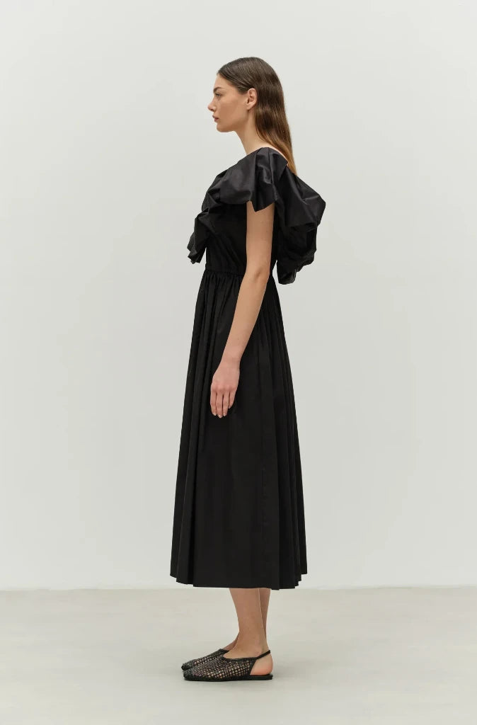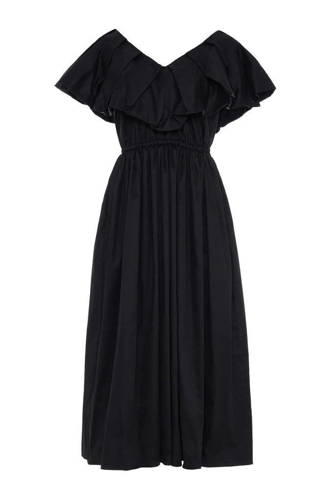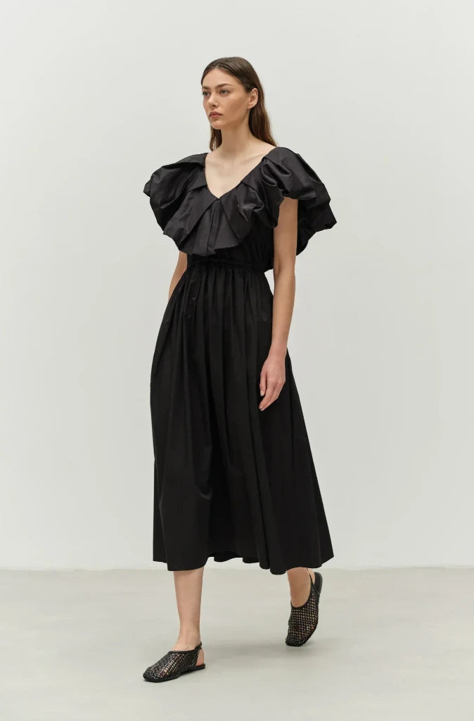 Made in Greece from soft, breathable poplin cotton in black, this dress features an elasticated waist with a deep v neck front and back with large ruffles. The skirt is full and midi length.