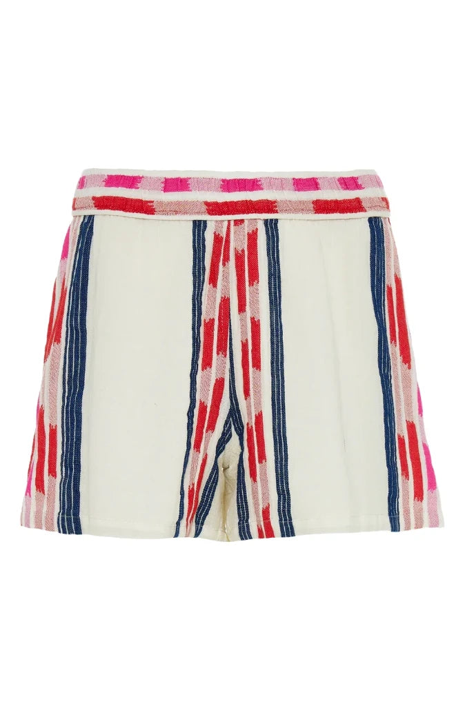 The Outopia shorts are relaxed fitting shorts with an elasticised waist and loose legs. The standout feature is a blue and red woven stripe on natural coloured cotton.