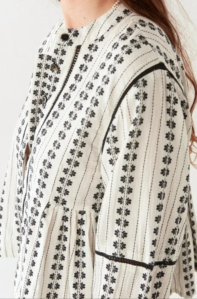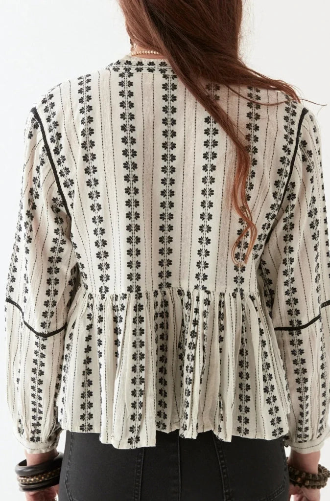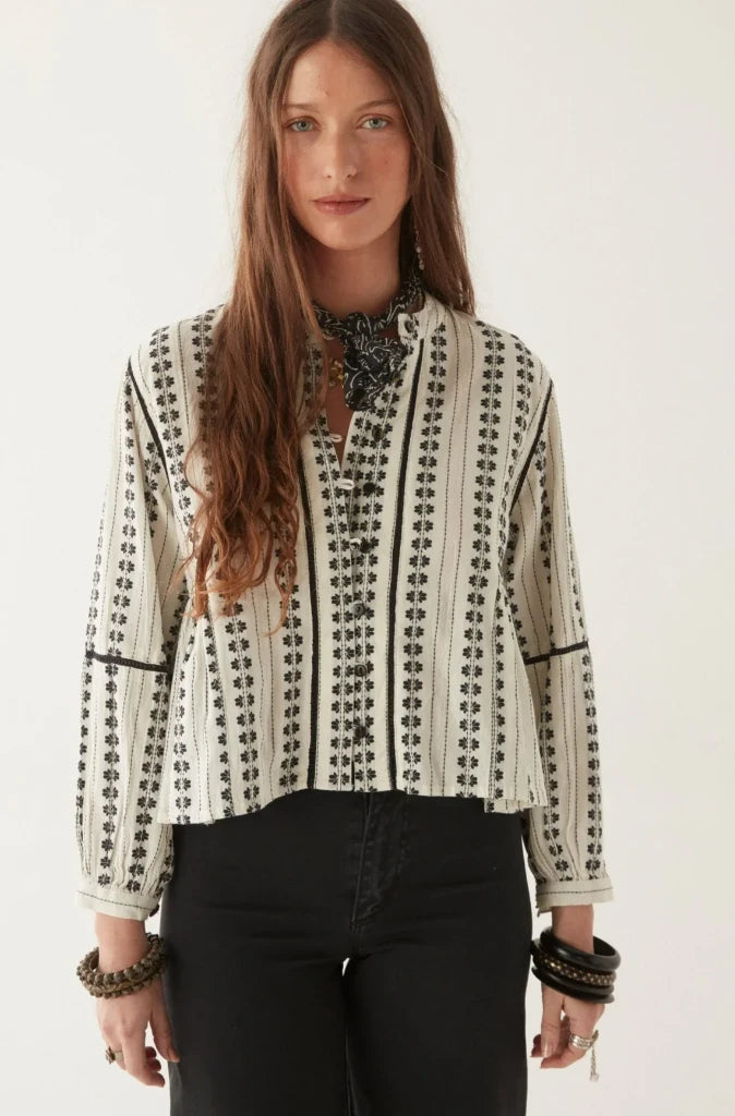 In a sun-faded vintage shell hue, the blouse sets the stage for striking black embroidery that flows in hypnotic, handcrafted patterns. The relaxed, cropped silhouette is balanced by subtle back pleats and gently gathered sleeves, creating a laid-back shape with refined attitude.