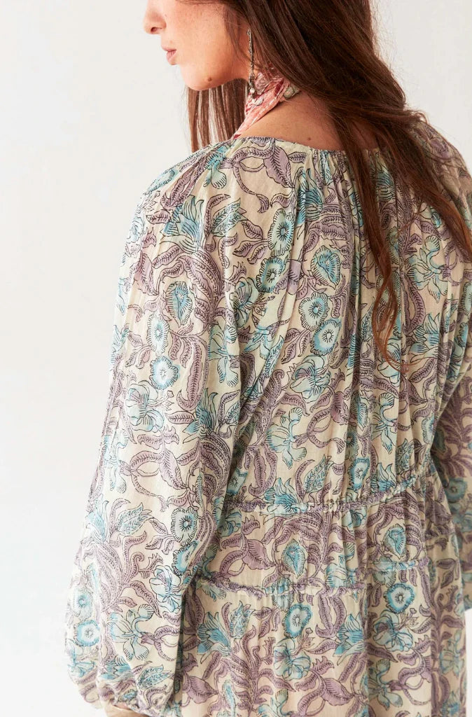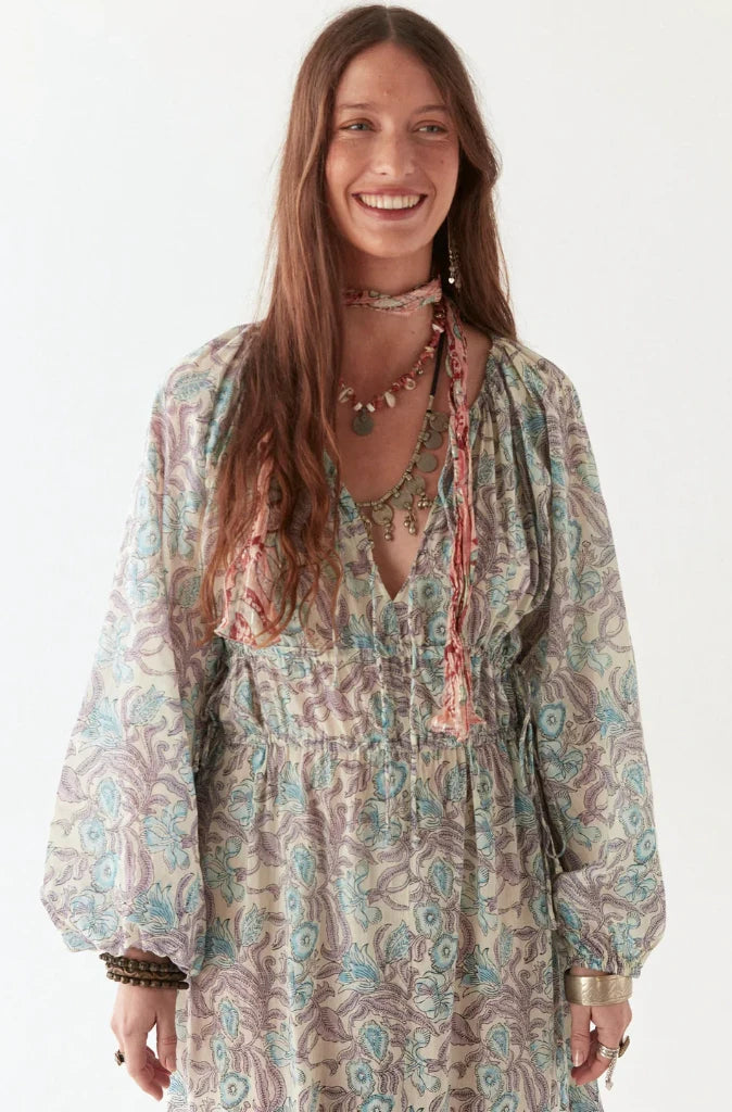 Made in India from a whisper light cotton voile, this wardrobe staple is cut in a flattering A-line style and is distinguished by a pretty buttery background with a red and grey floral pattern. Featuring a round neck with front opening with tie closures, long sleeves with elastic cuffs, a drawstring waist and of course, pockets!