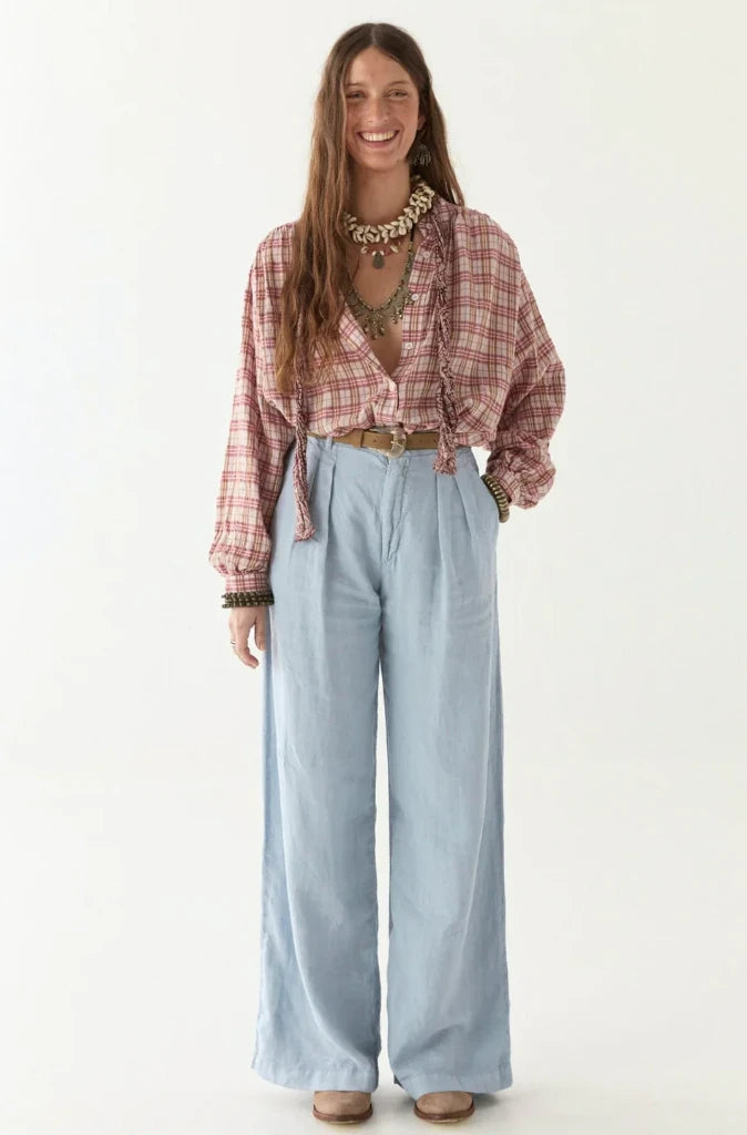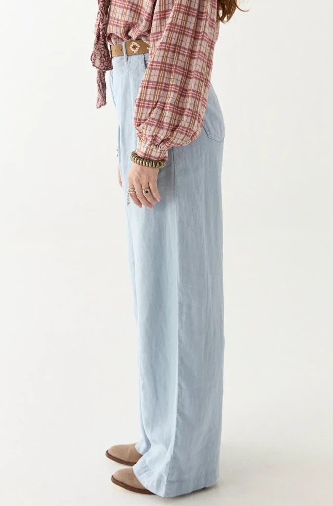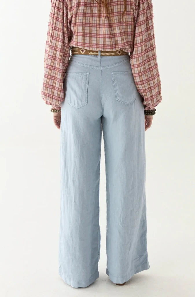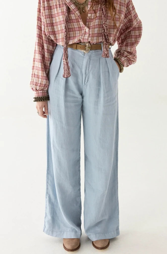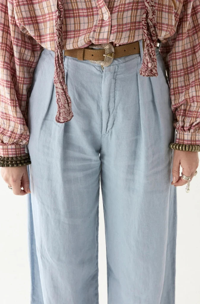 The Marisa is a best seller from Maison Hotel. Now in the soft blue, Cielo Infinito. These are, essentially, a grown-up version of the classic relaxed linen pant, with subtle tailoring paired with Maison Hotel's signature laid-back feel. Made in Spain from a pre-washed linen, the Marisa pants feature front pleating, side and back pockets, and are fitted at the hips before easing out into wide, relaxed legs. The waist has a comfortable mid-rise fit and the pants have a classic zip and button fly with belt loops. Quite simply, a great pair of summer pants.