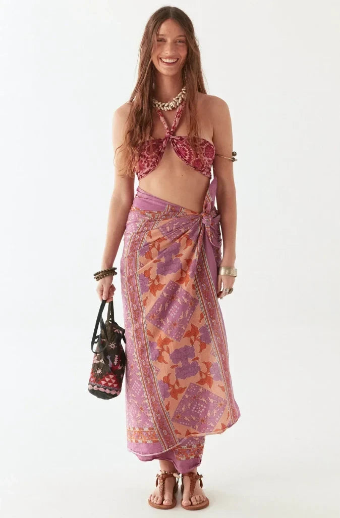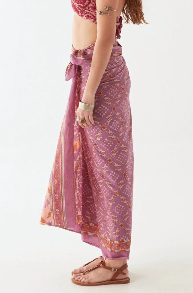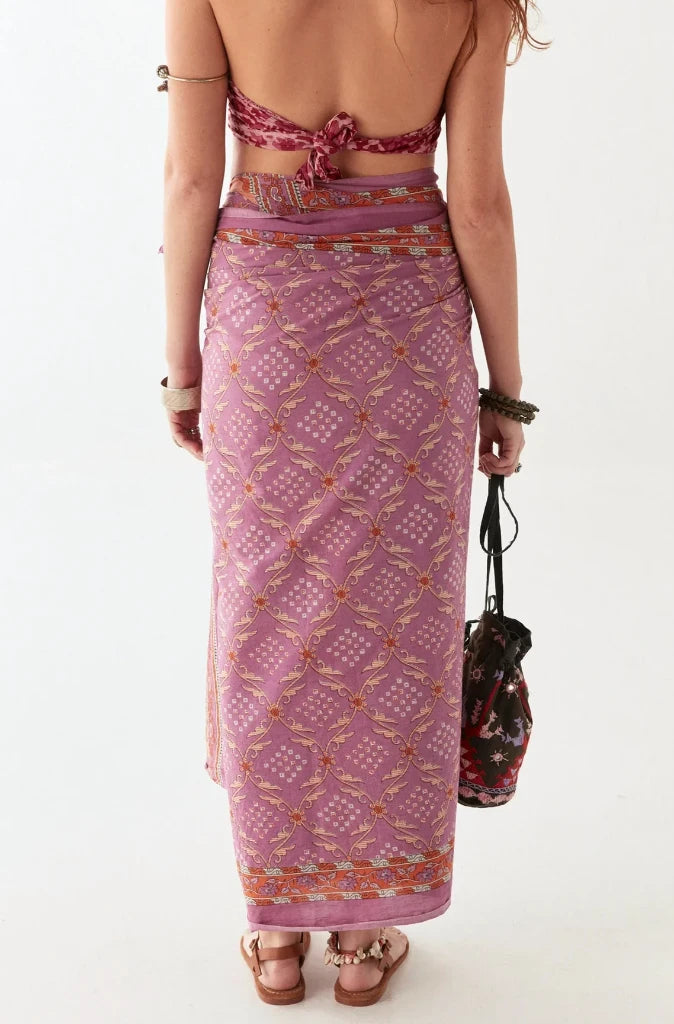 Drenched in shades of violet, amber, and sunset gold, the Purple Rain Byron Pareo is a flowing celebration of colour and movement. Inspired by vintage paisley motifs and reimagined through a bohemian lens, it moves effortlessly with every step, whether wrapped, knotted, or draped.