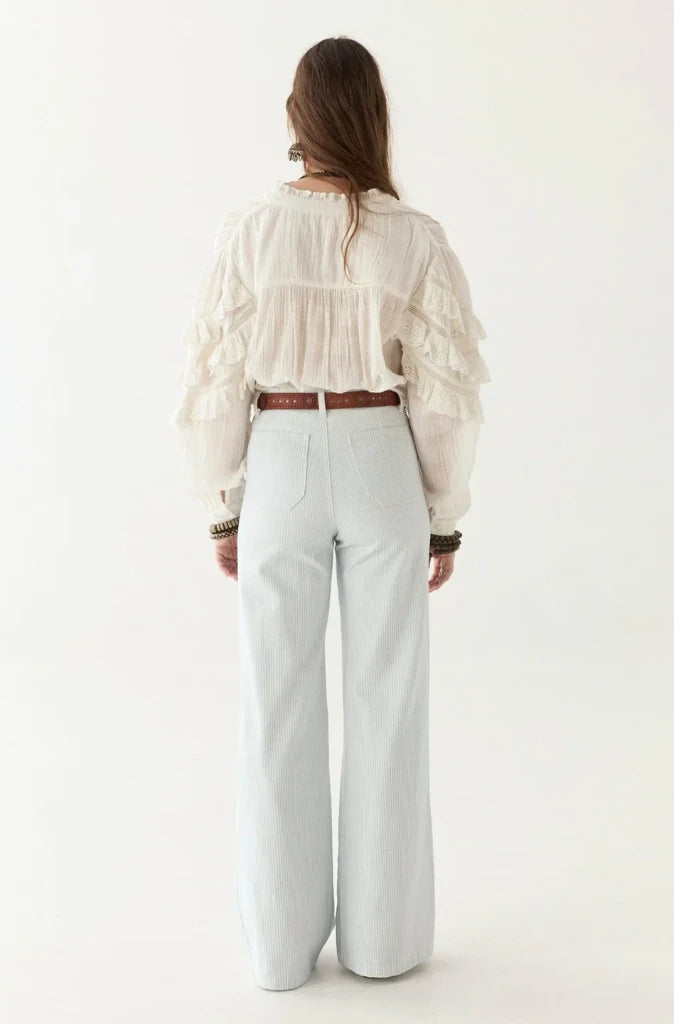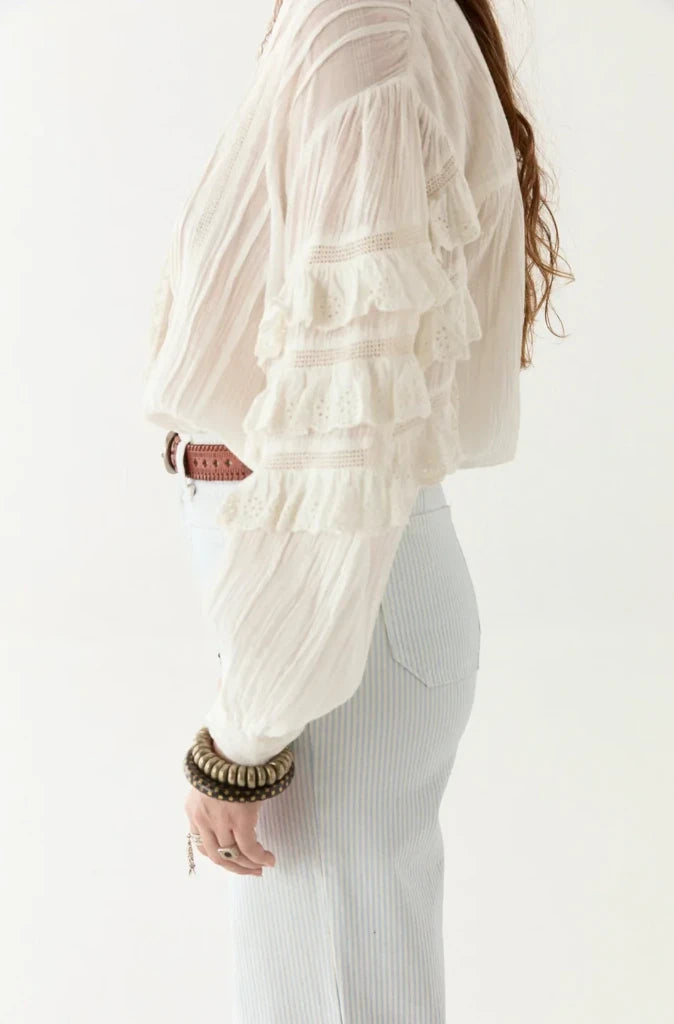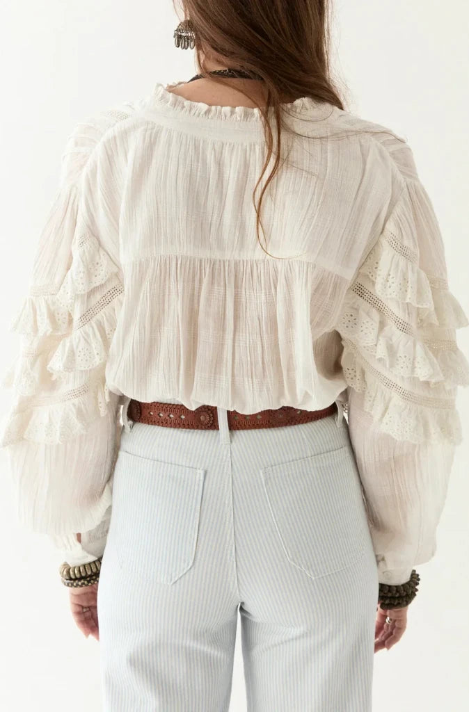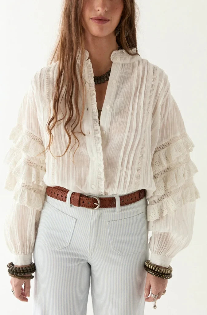 The Omara Blouse is cut from crisp off white cotton and detailed with schiffli embroidery that feels more like heritage than ornament. Its tiered sleeves bring sculptural movement—layered, expressive, and impossible to ignore.