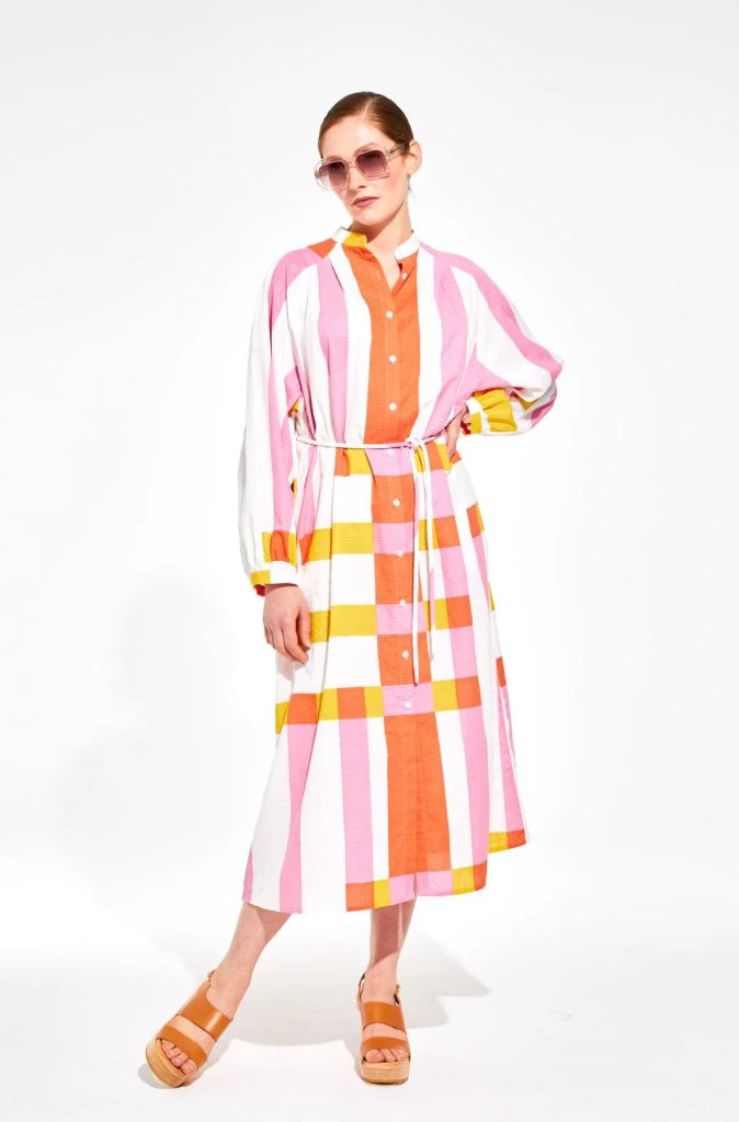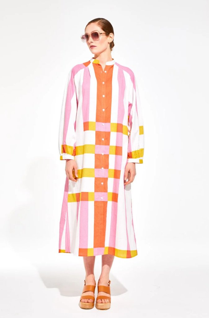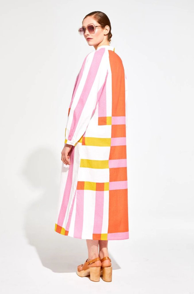 The Eulalie dress comes in a cotton poplin with the Bolero print. It has a loose, straight cut, mao collar, and front button placket. The full raglan sleeves are gathered and buttoned at the cuffs. Two side pockets and removable waist tie make this a wonderful warm weather dress for just about any occasion.