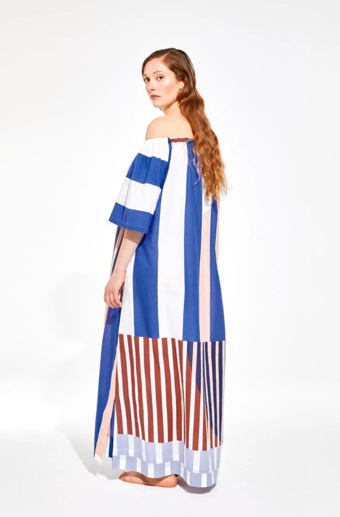 A lightweight, long cotton dress in a fun graphic print. Can be worn on or off the shoulders. Loose sleeves, side pockets and slits in the sides.