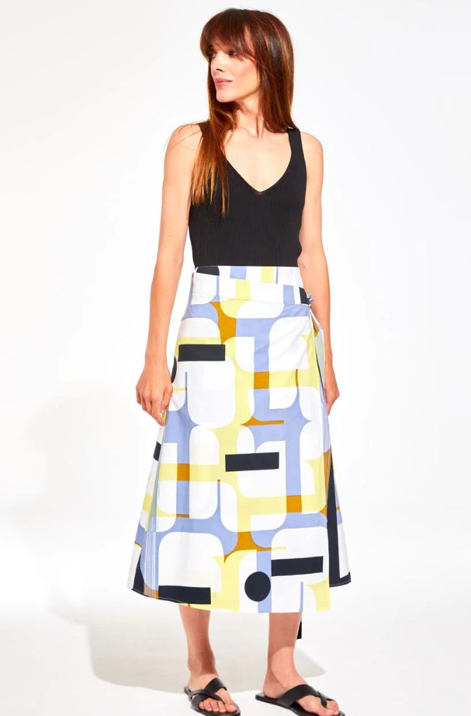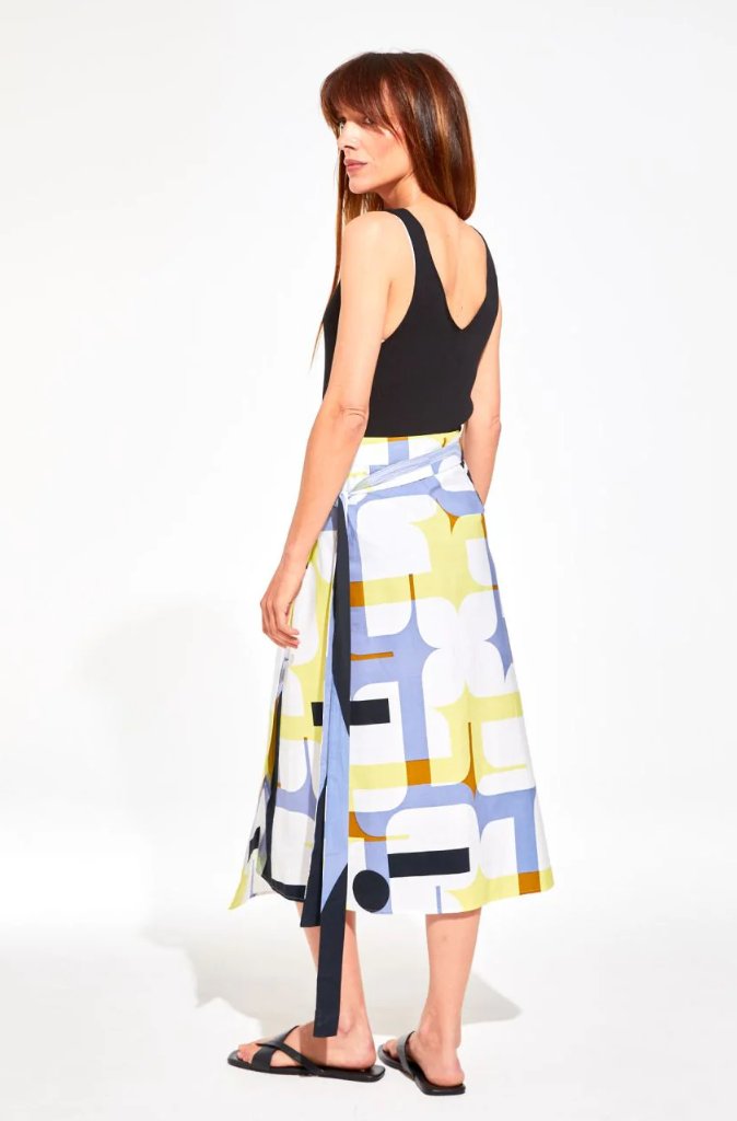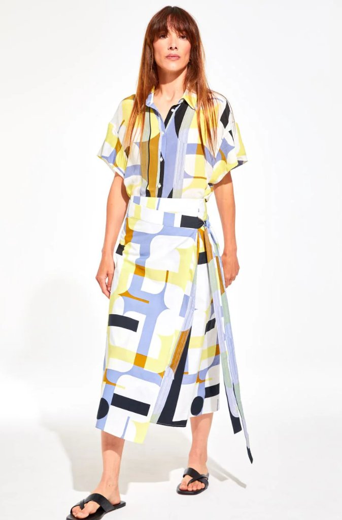 The Zoe Calice skirt is made from a soft cotton poplin printed with the Calice pattern. It is a high waisted, wallet shaped, straight cut wrap skirt. It has a side tie and right side slit.