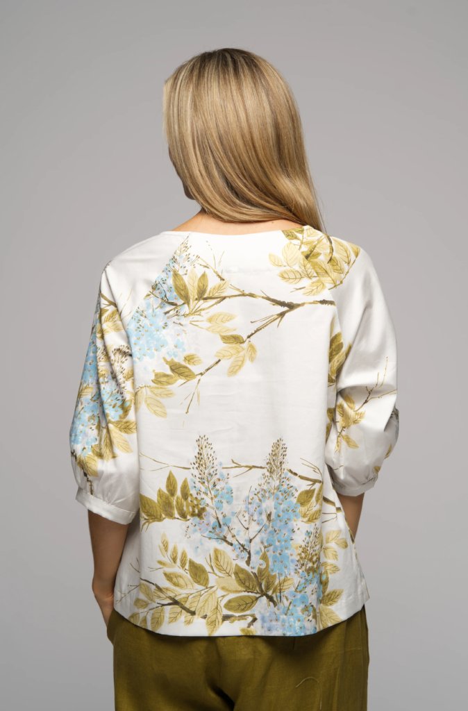 Echoing the simplicity of a 1950s shell top, the LS Wisteria top features a round neck and gathered, elbow length sleeves, highlighting its wisteria print.