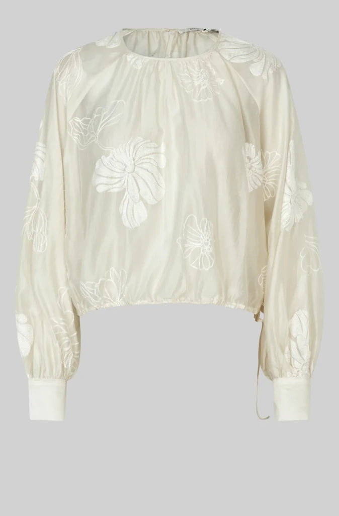 . The Veria Blouse in Tofu by Second Female is a beautifully detailed embroidered blouse designed with effortless femininity in mind. Crafted from a soft, semi-sheer fabric, it features delicate embroidered accents that add subtle texture and interest.
