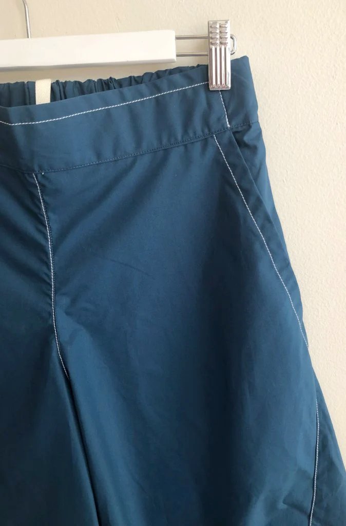 It boasts a flat front, elastic back, side pockets, and a unique tulip hem. The fabric is expertly cut to achieve a panelled effect, making it both casual and comfortable.