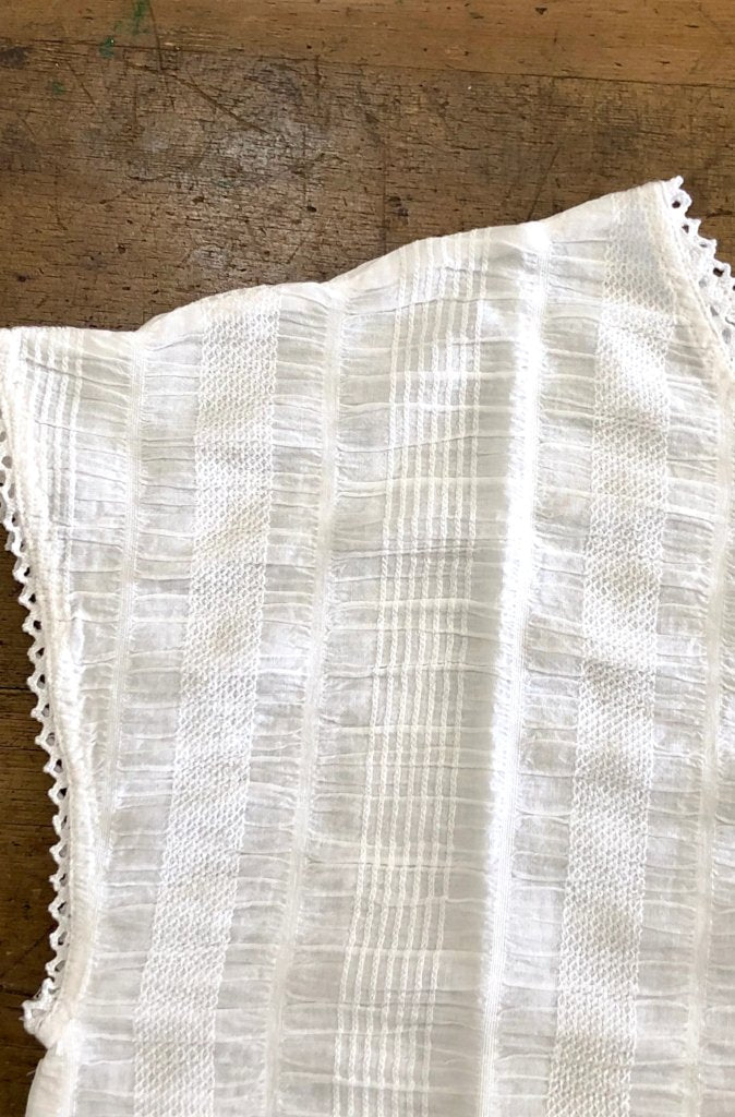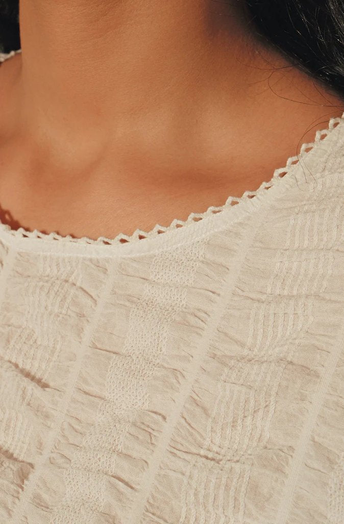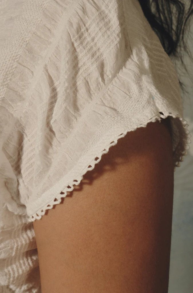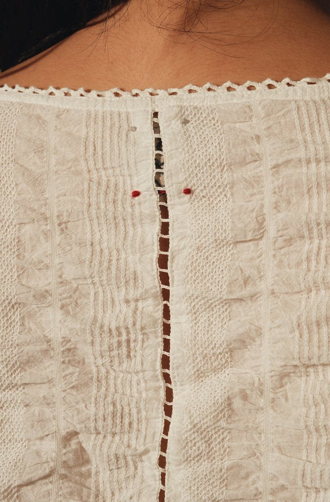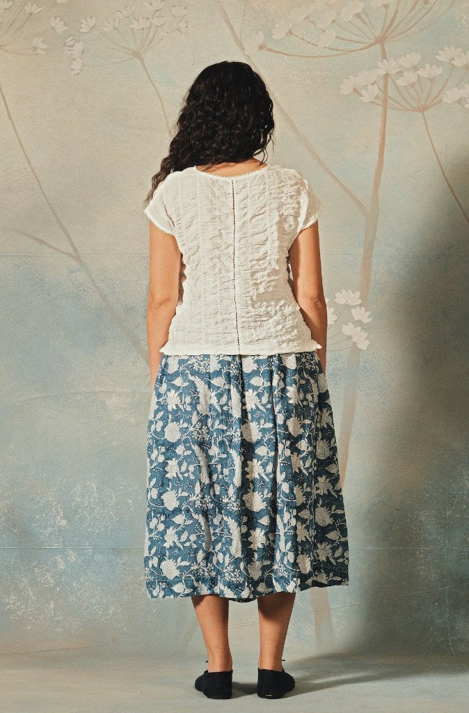 Like the Aishani, the Karni is a simple but beautiful cotton top perfect for hot summer days. This one is in a light cotton with all over fine stitching detail in vertical stripes alternated with an elasticised stripe which allows the top to mould to individual body shapes for a very flattering fit. The shoulders extend in to cap sleeves. Fine lace edging to the sleeves and neck make this an outstanding summer top.