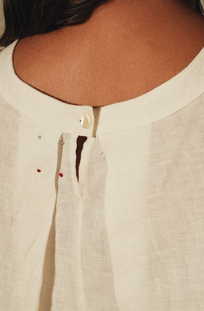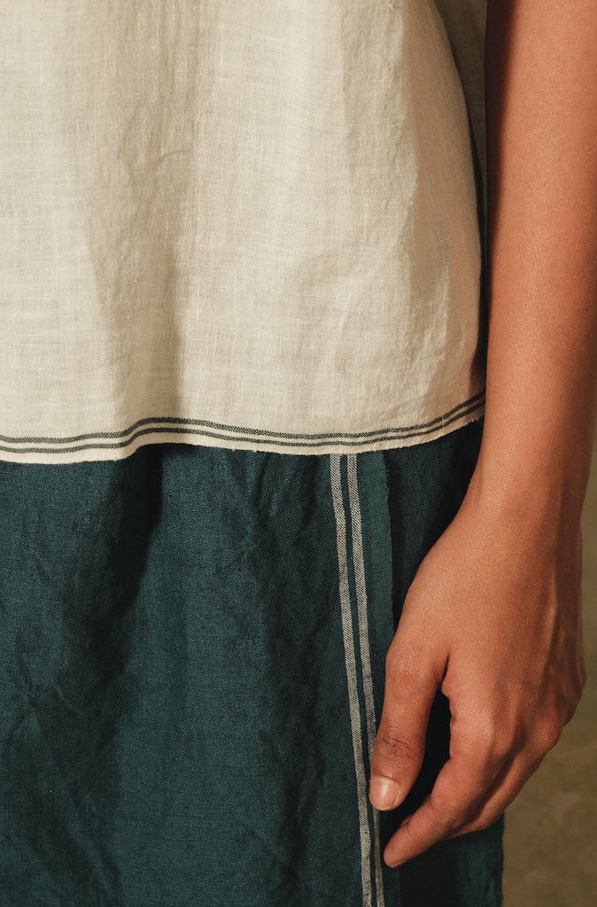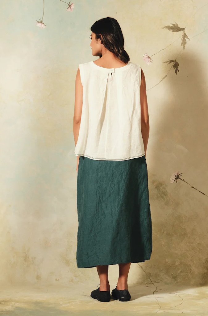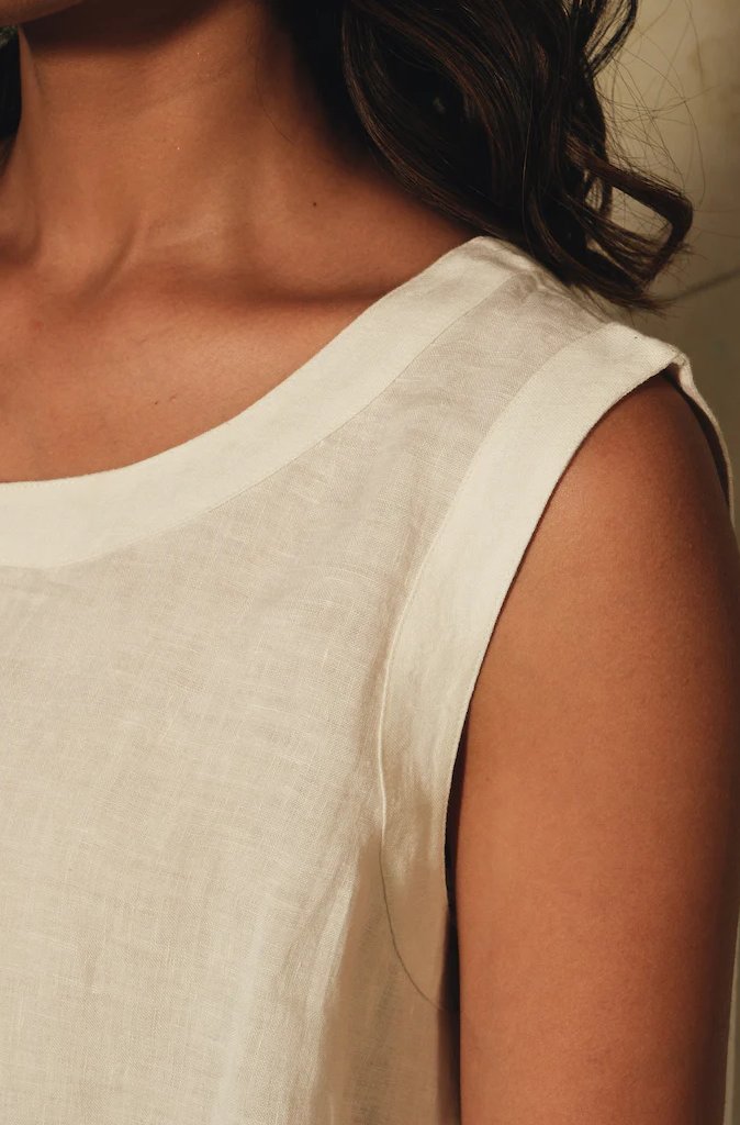 The Pamee is a great elevated linen tank top to wear with almost anything. The selvedge of the linen fabric is used at the hem to create interest and two pleats at the back add room for ease and comfort.