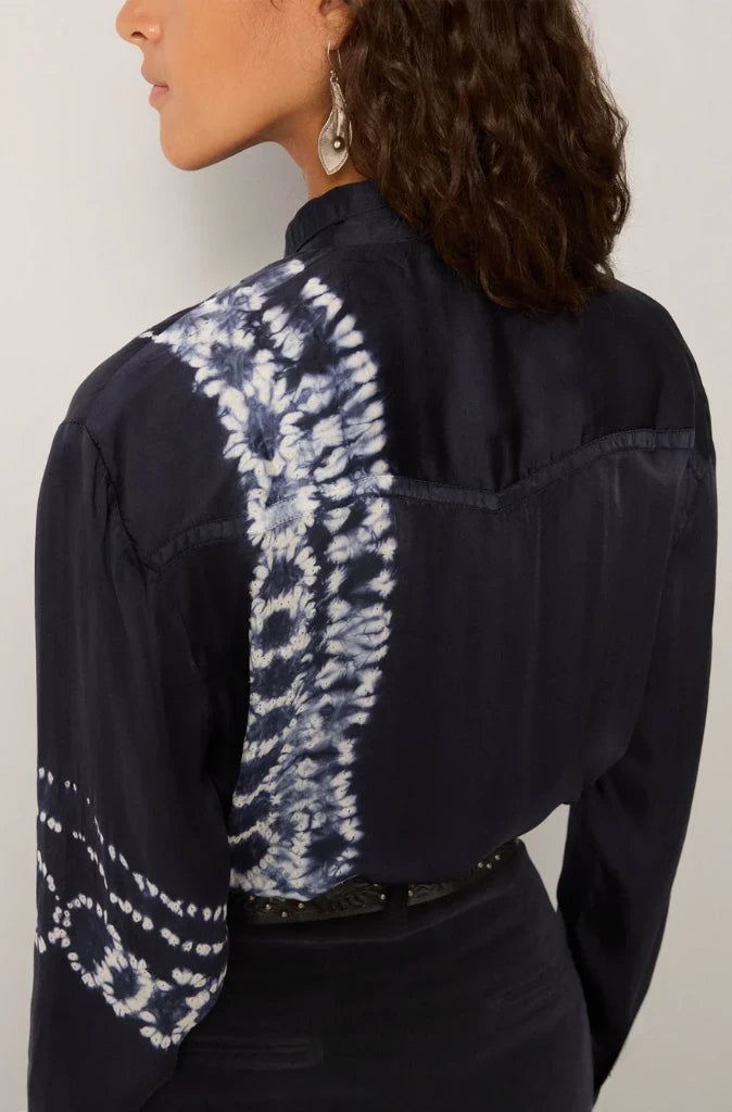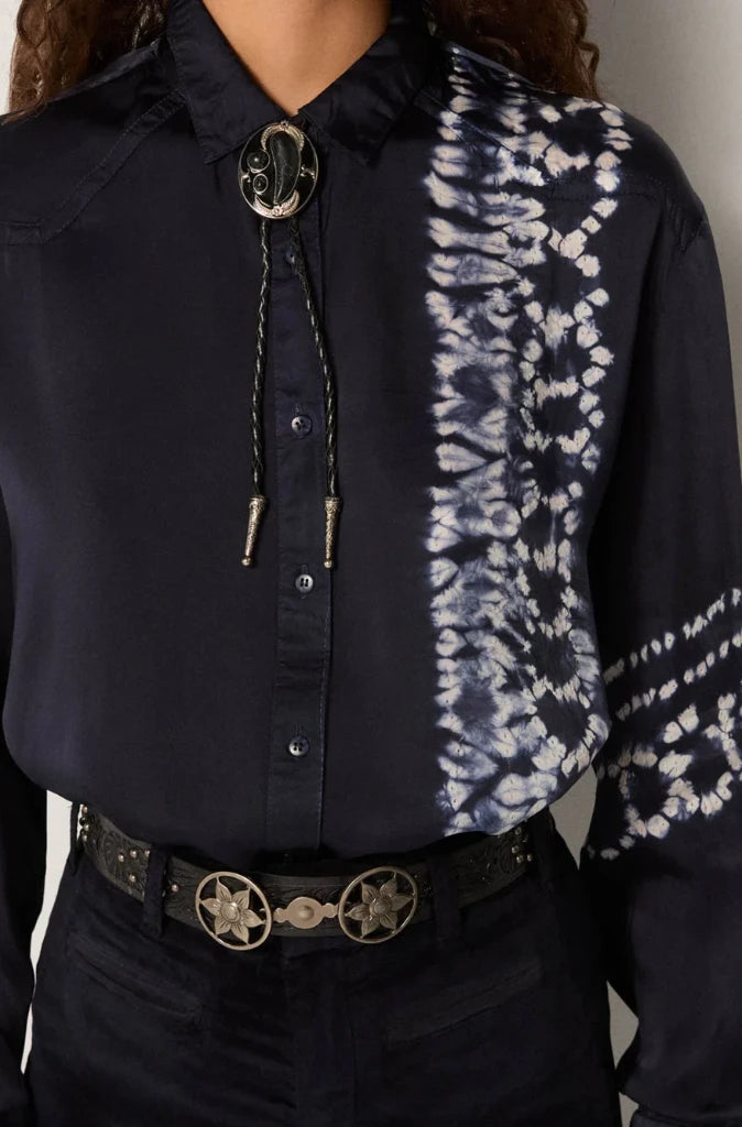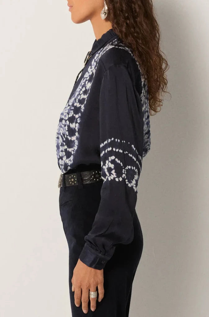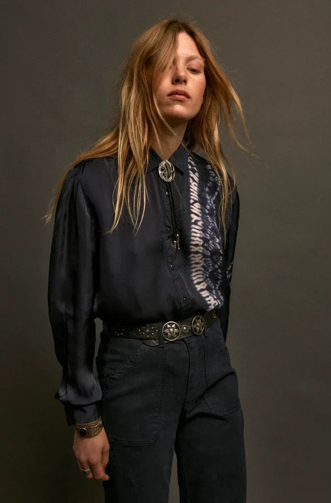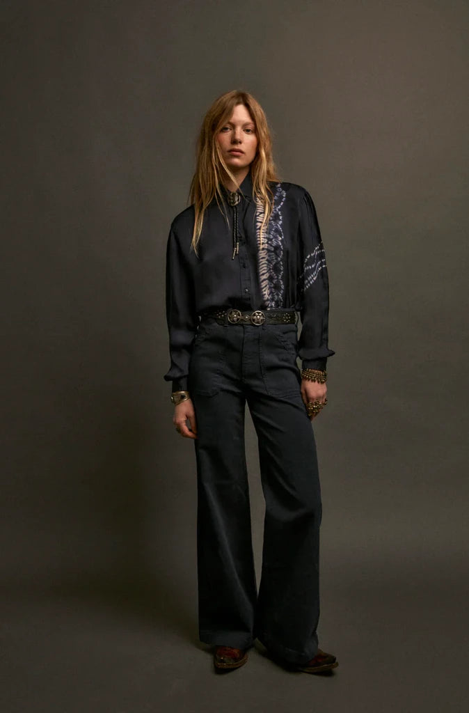 The Elizabeth Blouse in Blue Depths by Maison Hotel is crafted from 100% viscose with a fluid, liquid-like drape. Dyed in a deep navy that reads almost black, it offers a sleek, refined finish with a subtle natural sheen.