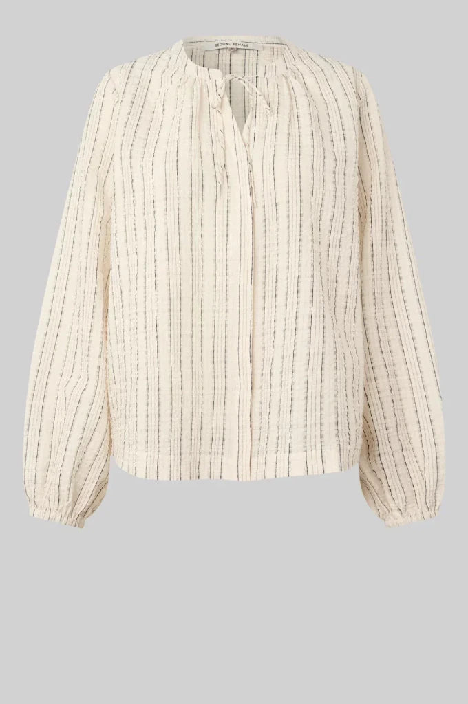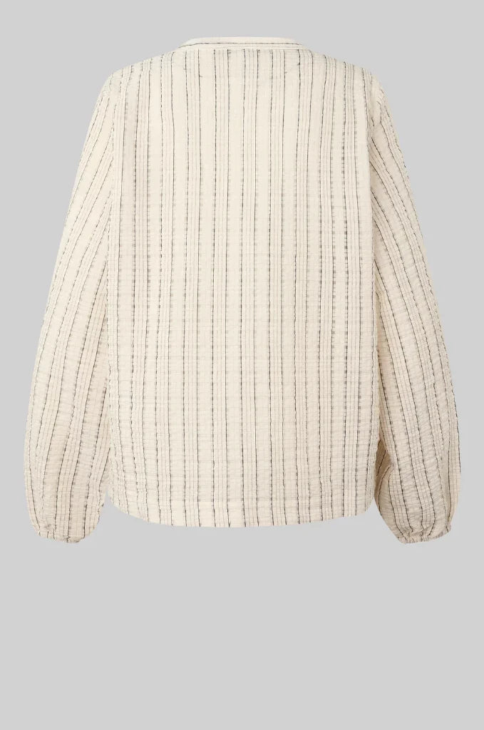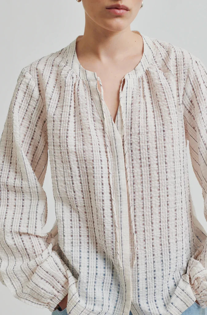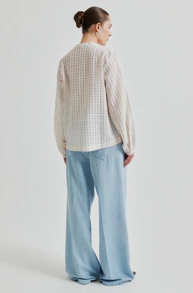 Second Female seersucker shirt. Made in a lightweight cotton blend with seersucker structure and checked see-through pattern. Fearing a mandarin collar with button-through fastening. Puffed shoulders with three-quarter length sleeves and elasticated cuffs. Gathers at back yoke. Relaxed and airy fit.