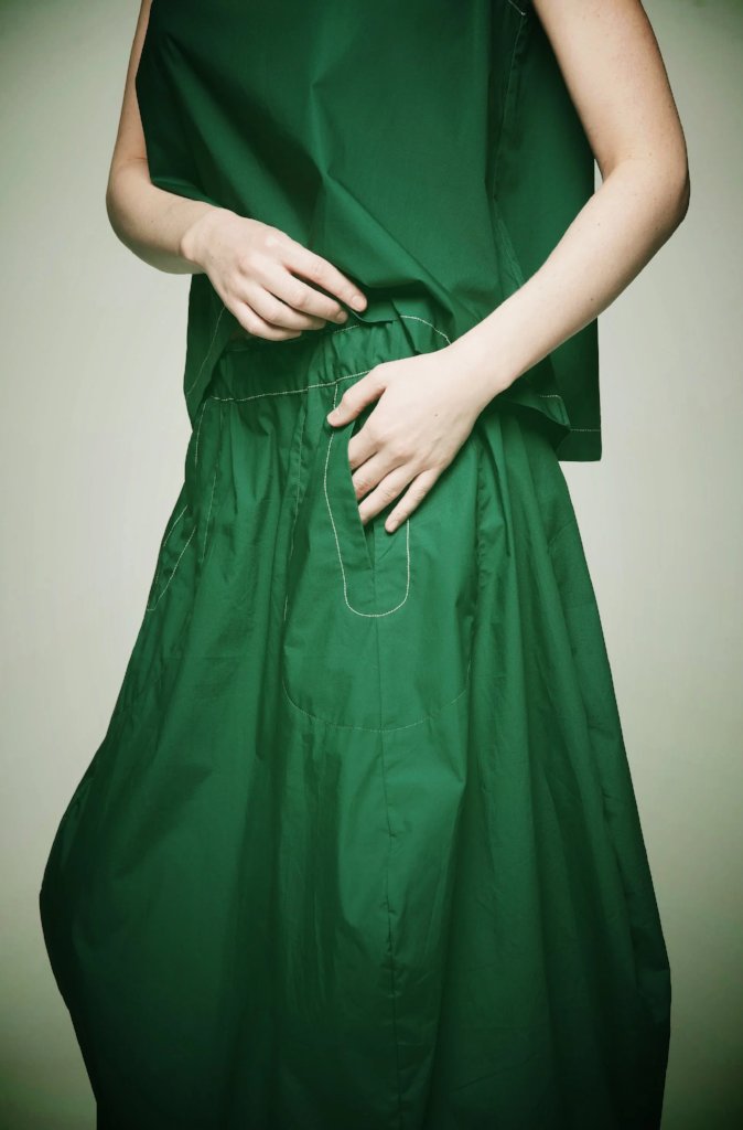 The Kaari skirt is effortlessly slipped on, showcasing distinctive pockets and a charming tulip hemline.