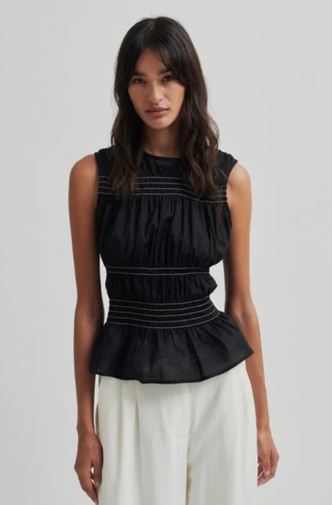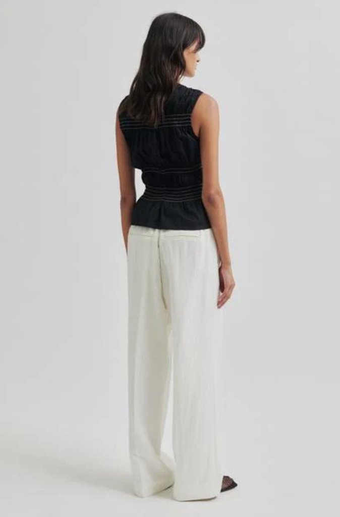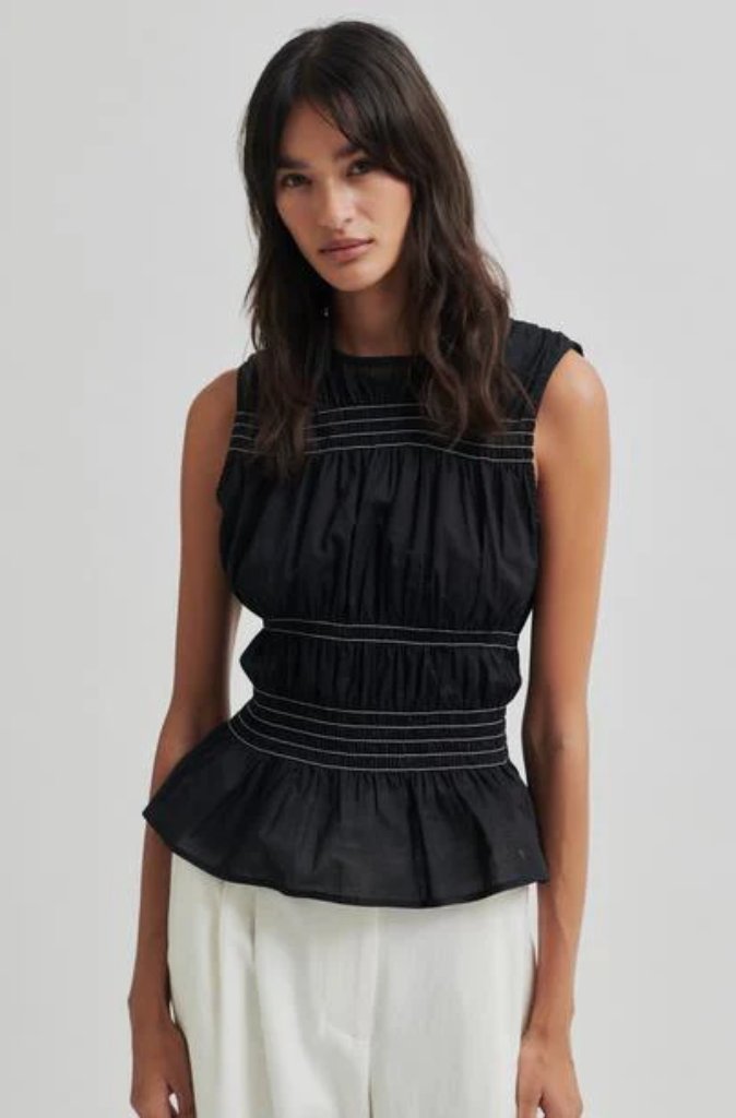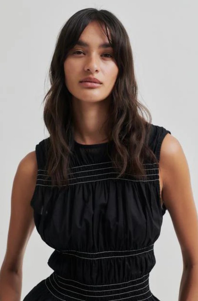 The Second Female Avida Top offers a sleek, contemporary look crafted from lightweight organic cotton. Designed with a round neckline and a concealed back zip, it features shirred detailing at the top and waist in a subtle contrast colour for a flattering, modern silhouette. The slim fit and sleeveless cut make it an effortless choice for both smart and casual styling — a minimalist piece with distinctive texture and Scandinavian edge.