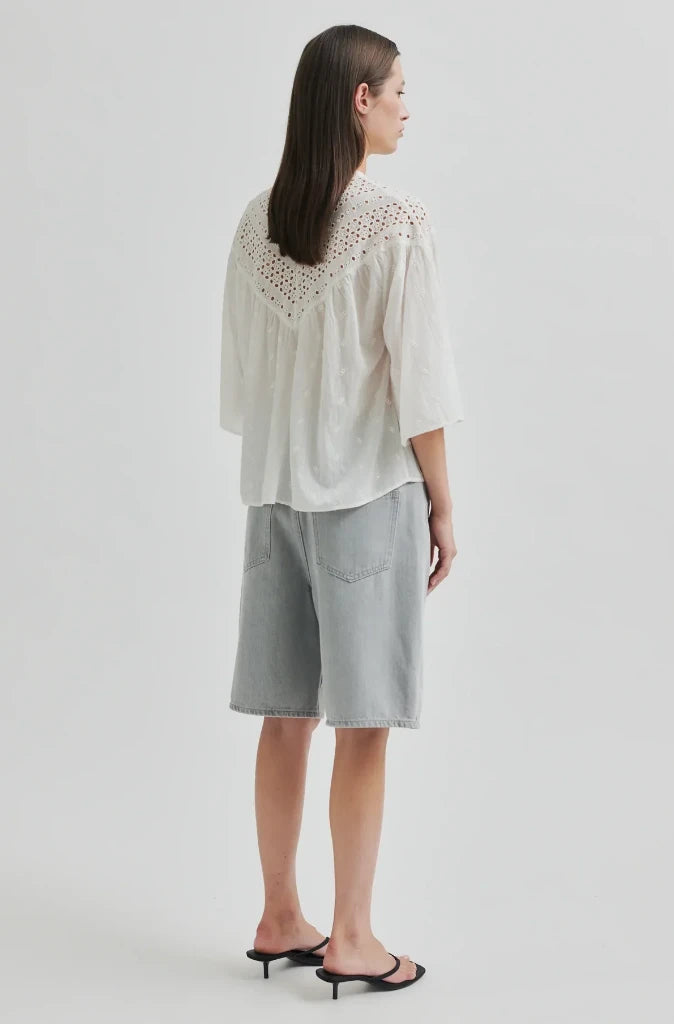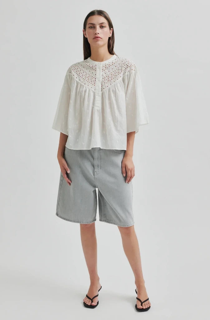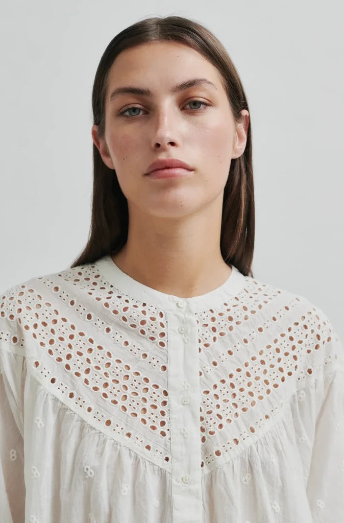The very lovely Second Female Ericae Blouse is crafted from light, airy cotton with a delicate tonal broderie anglaise pattern. Designed with a round neckline and button-through fastening, it features cropped raglan sleeves with softly flared ends for a feminine touch. The loose, relaxed fit gives it an effortless silhouette — perfect for pairing with tailored trousers or denim for a refined, easy look.